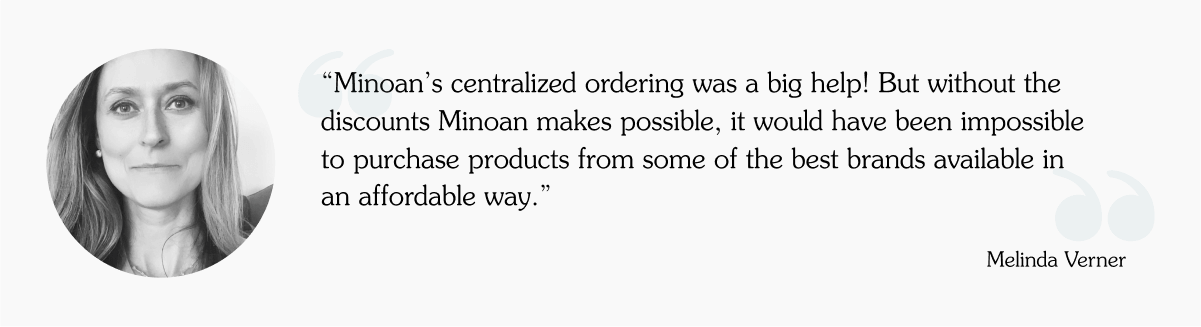 A: Minoan’s centralized ordering was a big help! But without the discounts Minoan makes possible, it would have been impossible to purchase products from some of the best brands available in an affordable way.